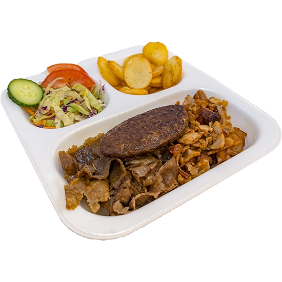 wordt geserveerd met kipfilet kofte shoarma doner champignon paprika ui salade friet/aardappelschijfjes of rijst met turks brood met saus naar keuzeIncl. € 0,15 Wettelijke Milieu Toeslag