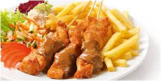wordt geserveerd met 3 kipfilet spiezen salade friet/aardappelschijfjes of rijst met satesausIncl. € 0,15 Wettelijke Milieu Toeslag